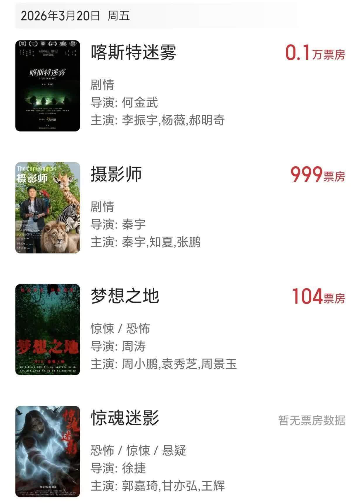 还有,除了另外一部好莱坞科幻大片《挽救计划》的票房表现还算可以之外,剩下的那九部电影各自的票房成绩都很惨淡。而最惨的一个,则是我们的国产恐怖片《惊魂迷影》。